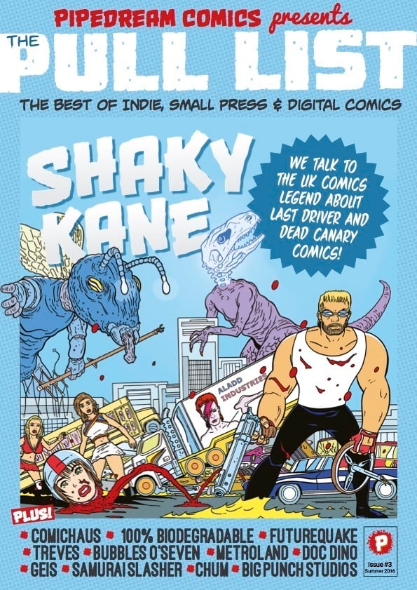 In the latest issue of our indie comics fanzine, produced by the team at Pipedream Comics (www.pipedreamcomics.co.uk), we celebrate the best of small press and the independent spirit of comics. We have an exclusive interview from UK comics legend Shaky Kane, discussing his new book Last Driver with a first look at some of the amazing artwork in this retro road movie inspired read!